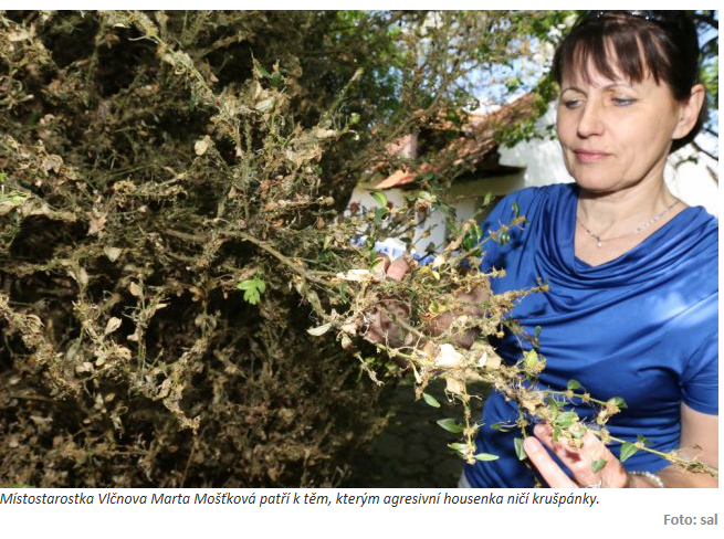 „I když to zní jako nadsázka, housenka keř doslova křupe. Než jsem si sehnal účinný postřik, spousty malých zelených tvorů mi spořádaly velkou spodní část sto let starého krušpánku. Zpočátku jsem vůbec nevěděl, o co jde. Když se housenky pustily do díla, připomínalo to zvuk, který vydává pravidelné řezání pily,“ říká Petr Blaha, kamenosochař z Vlčnova. A ukazuje na zničenou část keře. „Vidíte, keř vypadá, jako by ho někdo spálil…“ „Ty zvuky byly zpočátku, než lidé začali s postřiky, velmi nepříjemné. Hlavně v noci, když spíte při otevřeném okně,“ doplnil další z Vlčnovjanů.