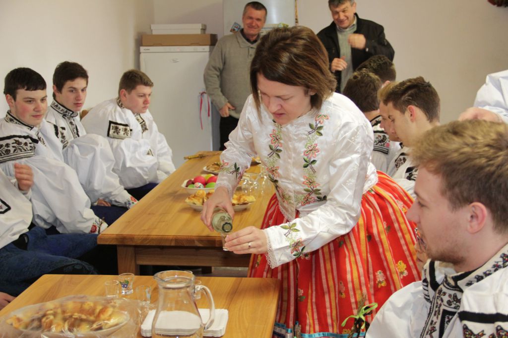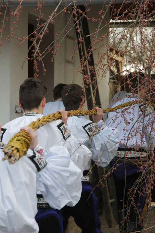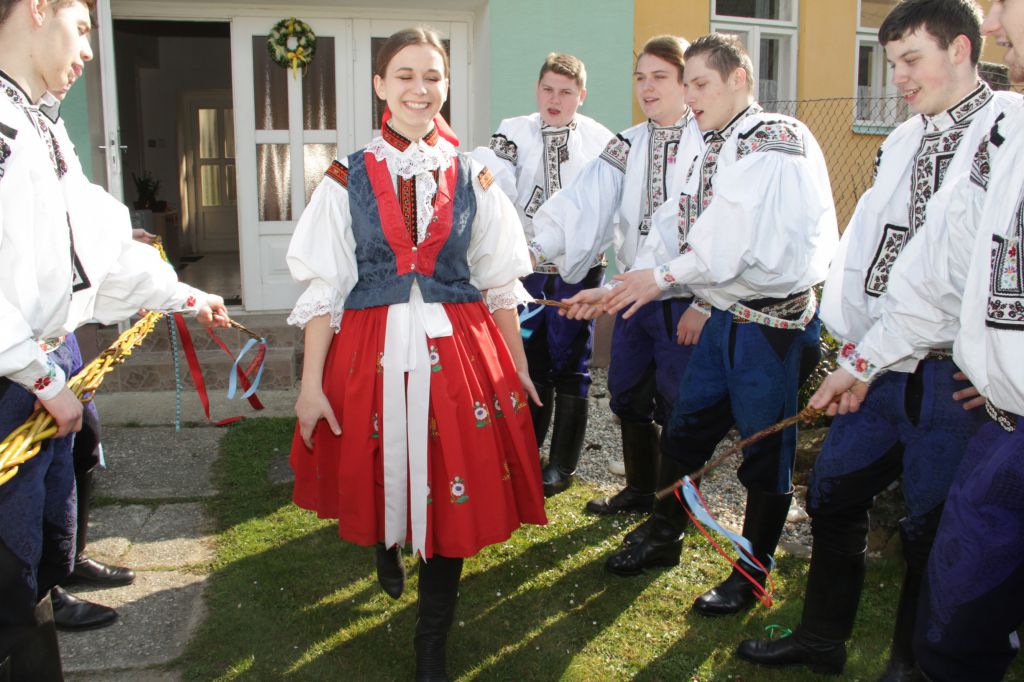 Držíc se za ramena a propojeni pětimetrovým kančůchem, jak se ve Vlčnově říká žile, tataru, šmigrusu, kocvaru či pomlázce, z plna hrdla prozpěvují do jarně se probouzející krajiny. Vzápětí už vyplácejí Šimonovu maminku Olgu. Ta každého odměňuje mašlí.