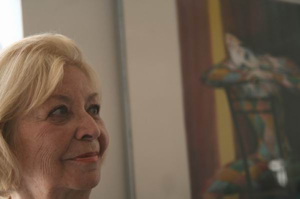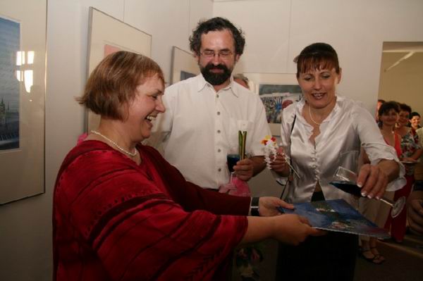 Sympatická dáma, chtěl jsem si ji vyfotit. Paní Daniela Benešová. Choť pana Beneše. Na rozdíl od něj se skoro pořád usmívala a vernisáž si natáčela i na videokameru. Zároveň poslouchala, jak jí jiné dámy i pánové lichotí a říkají, že jí to moc sluší. Měli pravdu. Ten pierot v pozadí je pierot jejího muže, na výstavě je k vidění v různých podobách. Když jsem se pana Beneše ptal, proč právě pierot, on mi povídal o tom, že mu nešlo ani tak přímo o postavu pierota, jako spíše o pocity, které má s ním spojeny - jako například lásku či nenaplněnou touhu...Škoda, že právě o tomto na vernisáži nepromluvil...Já sám pierota miluji od chvíle, co jsem viděl film Největší z pierotů, teprve potom jsem si přečetl i knížku o pierotovi od Františka Kožíka. Pro čtenáře mimo Slovácko - pan Kožík měl kořeny v sousedním Hluku...Také by si po čase zasloužil skorodoma připomenutí...