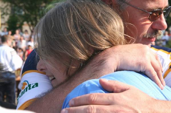 Paní Dolores jsem fotil ještě poté, co odešla z pódia. A můžu potvrdit, že byť někomu mohla znít její slova až příliš pateticky, byla vyslovena s největší upřímností. Viděl jsem v jejích očích slzy, a když si položila takto hlavu na rameno toho, který ji doprovázel, zmáčknul jsem spoušť....V neděli jsem ji viděl i na samotné Jízdě králů. Oslovil jsem ji, zajímalo mě, proč má tak silný vztah zrovna k Jízdě králů ve Vlčnově. A ona mi vyprávěla o obrázku, který měla po své babičce, na kterém byla právě vlčnovská Jízda králů.