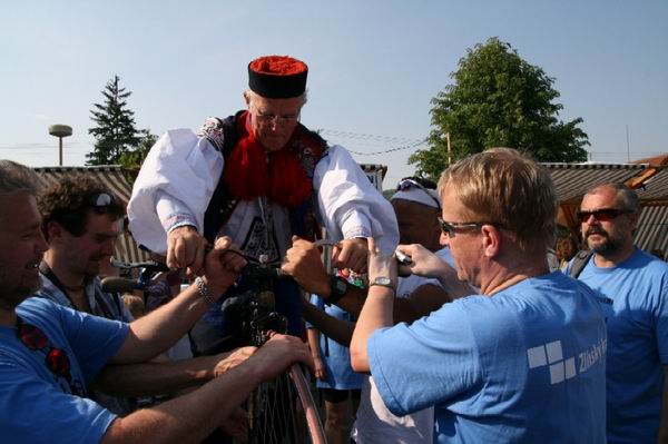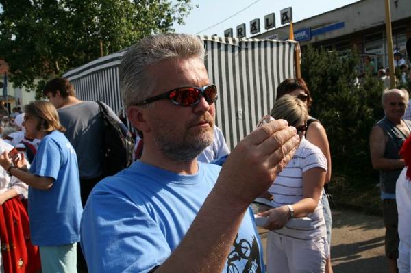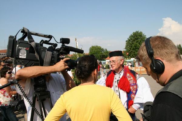 Opět pan Pavelčík, tentokrát už v jiné roli. Právě poskytuje rozhovor televiznímu štábu ARD, který byl ale český. "Když odpovídáte, dívejte se pořád na mě," slyšel jsem jednu z proseb. A tak zase a zase povídal, jak že se ta Jízda králů zrodila a jak je Vlčnov poslední místo, kde se jezdí každoročně a vždy jen ročník osmnáctiletých. ARD pořad odvysílá v dvacetiminutovém dokumentu v rámci pořadu Cesty kolem světa. Hrozně rád bych se podíval, co dokumentaristy zaujalo a co ze slavností "vypíchnou".