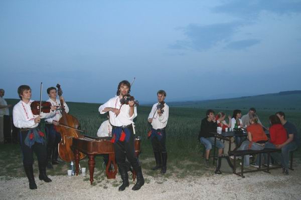 Tak a nyní smeknu svůj klobouk. Mladí Burčáci. Mají můj obdiv. Takto hráli v sobotu večer ve vlčnovských bůdách. Oblíbený to bod slavností, obrovské množství lidí večer stoupá z vesnice směrem k vinohradům a tady poslouchají muziku. Chtěl bych napsat, že i zpívají, ale - upřímně - slyšel jsem především zpívat Mladé Burčáky. I ve vlčnovských bůdách bylo možné pozorovat, jak zpěv mezi lidmi pomalu mizí. Ale zpět k Burčákům. Byli vynikající! V pátek hráli ve Vlčnově do noci. V sobotu jsem je potkal, když hráli v Kunovicích dětem, které soutěžily ve verbuňku. A večer už byli zase ve Vlčnově, počítám, že hráli dlouho přes noc. A vždycky jeli naplno, muzikou se viditelně bavili. Vážení, není to mezi cimbálovkama zase tak samozřejmé.