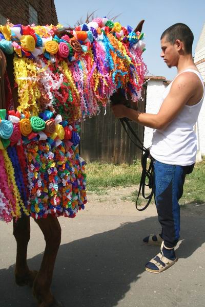 A ještě pan Konečný. Tentokrát už ve Vlčnově. Zatímco královská družina se chystá do kostela, koně mají ještě poslední chvíle oddechu. Za chvíli si je "rozeberou" jednotlivé rodiny, které začnou koně strojit. Snad jen pro vysvětlení. Možná právě vše kolem koní je to, co se v tradici Jízdy králů změnilo nejvíce. Dřív bylo na každé vesnici koní obrovské množství, skoro každý kluk jezdil na koni od dětství. To samozřejmě dnes absolutně neplatí. Vlčnovjané si koně musí půjčovat a samotní kluci ani na koních příliš jezdit neumí. Také proto je při samotné jízdě neuvidíte bez toho, aniž by jim pomocník koně držel. Kluci se chodí alespoň zaučit, ale jejich snaha není vždy velká. Někteří toho moc nenajezdí - prý nemají čas. Přesto musím dodat. I tak - nebo možná právě proto - byl výkon kluků během neděle docela slušný.