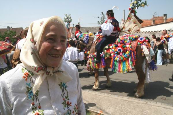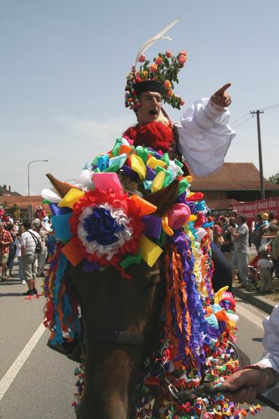 Nevím nevím, tímto snímkem zřejmě nepotěším Vlčnovjany a naopak rozradostním sousední Hlučany, kteří mají rovněž Jízdu králů - mimochodem také velmi zajímavou - a těžce nesou, že ta Vlčnovská je o hodně slavnější, přestože podle nich má spoustu vad na kráse. A možná by k nim přidali i tu na snímku. Král si totiž letos v jednu chvíli vytáhl růži z úst, prohodil tiše několik slov ke svému pobočníkovi, chvíli váhal a nakonec se napil z pet láhve vody. Vždyť bylo vedro! Kdybychom byli přísní vykladači tradice, král by měl mít růži nepřetržitě v ústech a neměl by prohodit jediné slovo. Proč? Podle jedné z legend totiž "hraje" krále na útěku, který nesmí být poznán. Proto ženský kroj, proto růže a mlčení, které neprozradí jeho vznešený původ.