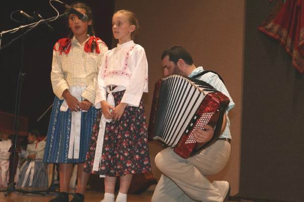 Velký zážitek pátečního večerního programu. Ten s harmonikou je učitel z Nivnice Vlastimil Ondra. Ve Vlčnově předvedl se svými dětmi z Nivnice a Bánova velmi zajímavé představení, které sklidilo po právu pořádný potlesk. Chtěl bych vám o něm toho říci tolik, že si raději nechám psaní o něm na později. Snad jen dodám - osobnost Slovácka, jehož chápání folklóru je mému srdci nesmírně blízké. Však se podívejte na stránky wwww.nivnicka.cz nebo www.kuratko.unas.cz. Pravidelní čtenáři mých stránek vědí, že se o něm a jeho stránkách nezmiňuji zdaleka poprvé.
