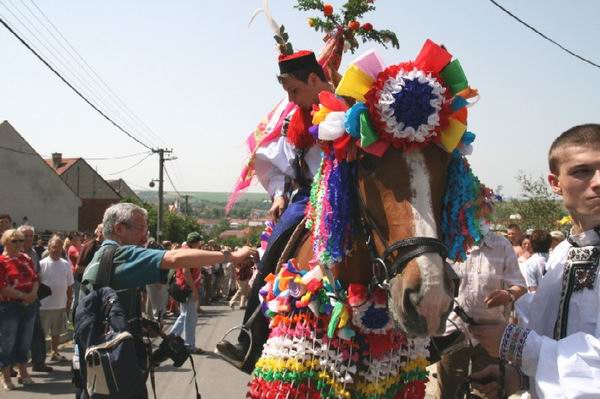 A ještě k těm penězům. Tady ve Vlčnově nebo například i v Kunovicích mají kluci připevněné na koně přímo pokladničky, do kterých peníze sbírají. Občas slýchávám pohoršené názory i příznivců samotné Jízdy králů, kterým se takový zvvk ani trochu nelíbí. Pravda, působí to poněkud nepřirozeně. Vhazování peněz do bot určitě odpovídá i mnohem lépe tradici. Ale když ono toho asi do té pokladničky vleze víc, že ano.