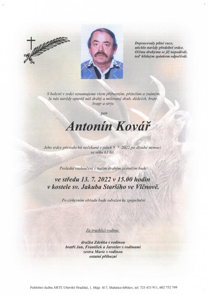 Ročník 1958 žádá rovníky a spolužáky, aby se zúčastnili pohřbu zemřelého rovníka pana Antonína Kováře. Pohřeb se koná ve středu 13.7. v kostele sv. Jakuba ve Vlčnově. Sraz ročníku je ve 14:45 hodin před kostelem.