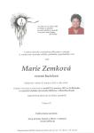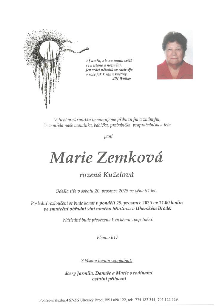 Rozloučení s paní Marií Zemkovou, roz. Kuželovou se koná v pondělí 29. prosince ve 14.00 hodin ve smuteční obřadní síni nového hřbitova v Uherském Brodě. Následně bude převezena k tichému zpopelnění.